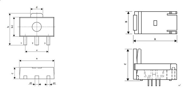 產(chǎn) 品 型 號(hào) IC封裝 a b b1 c d d1 d2 e A B C 054-0089-031 SOT-89-3L 4.5±0.2 4.1±0.2 2.5±0.2 1.5±0.2 1.65±0.1 0.5±0.1 0.4±0.1 3.0±0.2 24.7 12.6 18.0DESCRIPTION & ORDERING INFORMATION